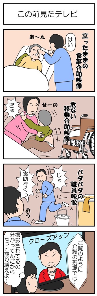 第3弾 平成から令和へ 蔵出し4コマ (忘れてはいけない編) 川崎老人ホーム連続殺人事件は2014年(平成26年)11月から同年12月にかけで発生。元職員が逮捕された連続殺人事件。 「高齢者をベランダ から投げ落とし転落死させた」と供述。 国民の4人に1人が75歳以上の後期高齢者となるのが2025年です。 団塊の世代がすべて75歳以上になるこの年に、介護職員は約34万人不足すると言われています。現在でも人材確保が困難な介護現場の深刻さは、なにか事件があった時に、ワイドショーなどで興味本位に取り上げられるくらいです。